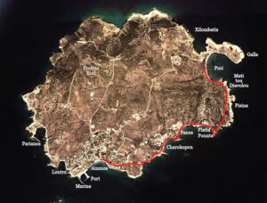 Ξεκινώντας από το χωριό ακολουθούμε τον παραλιακό δρόμο προς τα ανατολικά. Θα περάσουμε μέσα από τη συνοικία Στρούμπος, από την παραλία Χοντρός Κάβος, τις παραλίες Χαροκόπου, Φανός, Πλατιά Πούντα, θα κάνουμε μία βουτιά αν το θελήσουμε και θα συνεχίσουμε. Θα δούμε την Πισίνα, την σπηλιά ‘Το Μάτι του Διαβόλου’ και θα φθάσουμε στην παραλία Πορί.